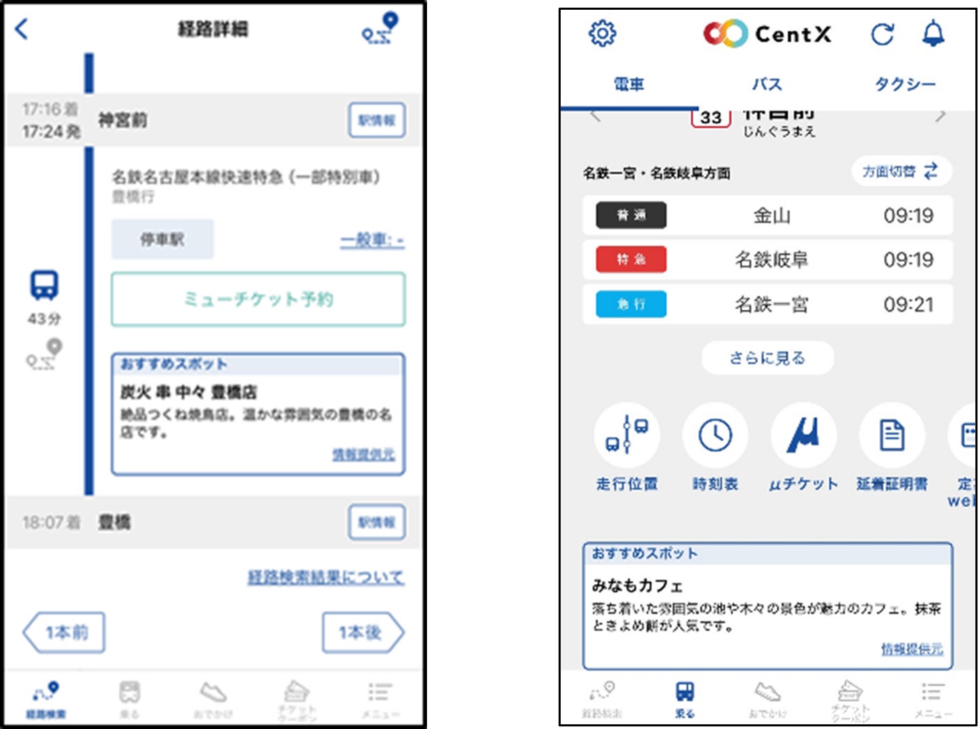 当社システムによって創出するトピックを、名古屋鉄道のアプリ「CentX」に提供します。「CentX」では、トピックが表示される対象駅を「マイ駅」として登録したり、または乗換案内において目的地として検索したりすると、駅周辺のおすすめスポットとしてトピックが表示されます。また、アプリ内で表示された画面領域をタップすることで関連サイトへ遷移し、お店の詳細などより詳しい情報を閲覧することができます。「おでかけ情報」の充実化による移動需要の創出や移動中の立ち寄り促進を図ります。