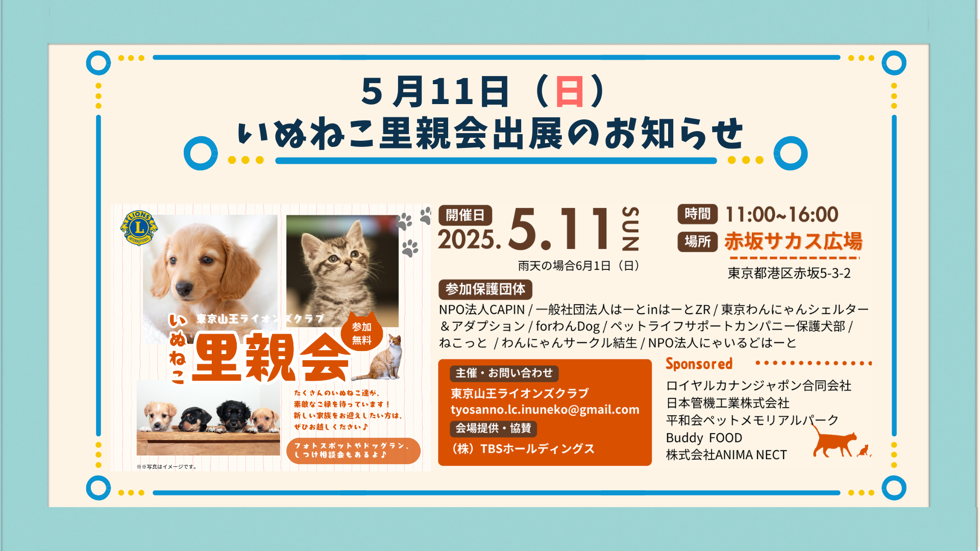 株式会社ANIMANECT(アニマネクト)は、保護犬・保護猫と暮らしたいと願うシニア世代に向けて、新たな出会いの場を提供します。2025年5月11日(日)に赤坂サカス広場(TBS前)で開催される「いぬねこ里親会」(主催:東京山王ライオンズクラブ)に、動物保護団体のNPO法人にゃいるどはーとと共に出展いたします。本イベントでは、保護犬ふれあい会やツキネコ北海道グッズ販売、そしてアニマネクトのサービスのANIMANECTの無料相談会を実施し、シニアの方々が安心してペットと触れ合い、相談できる機会を提供します。