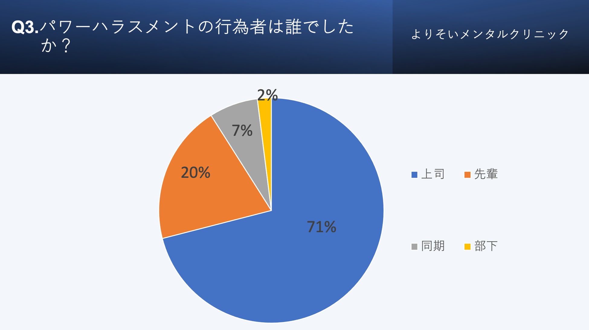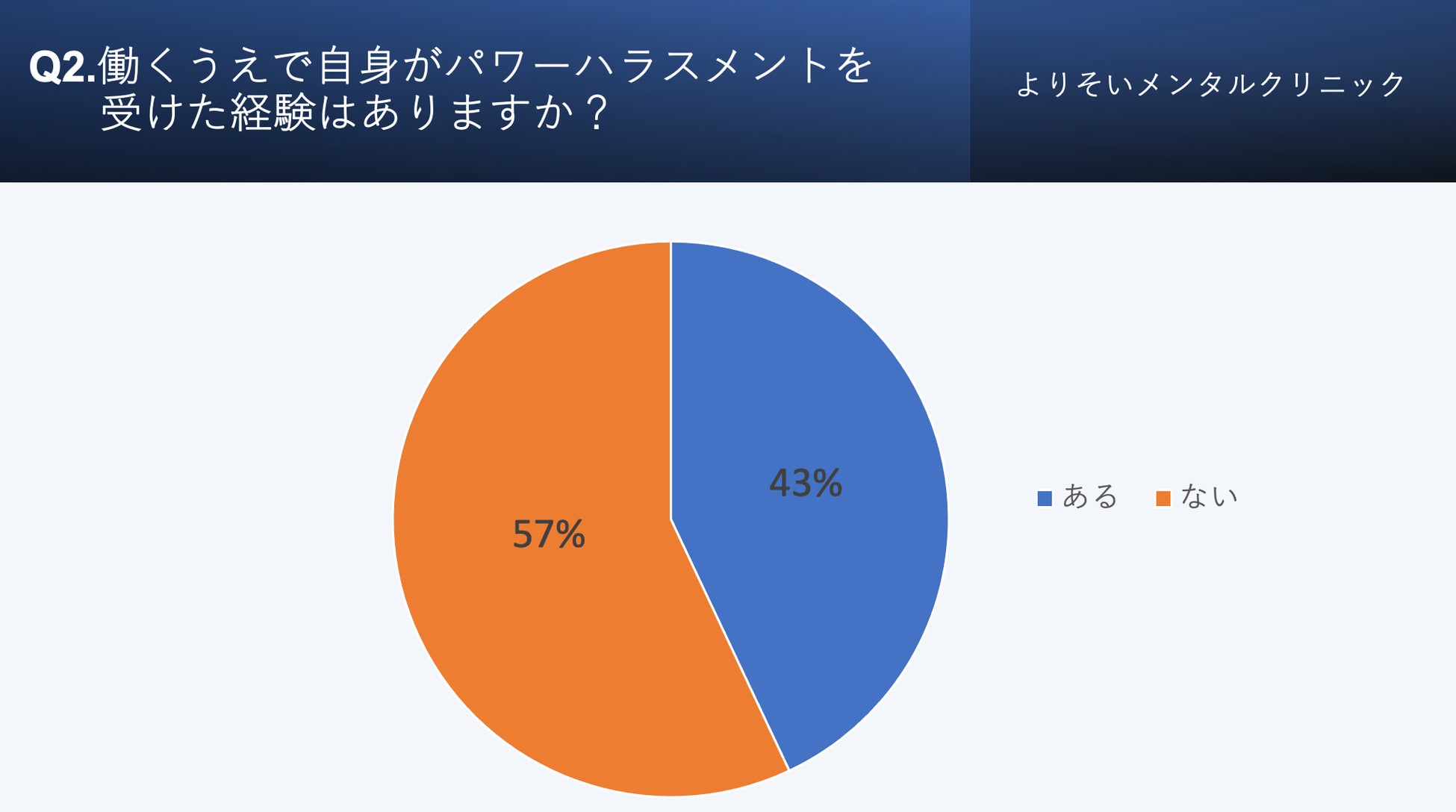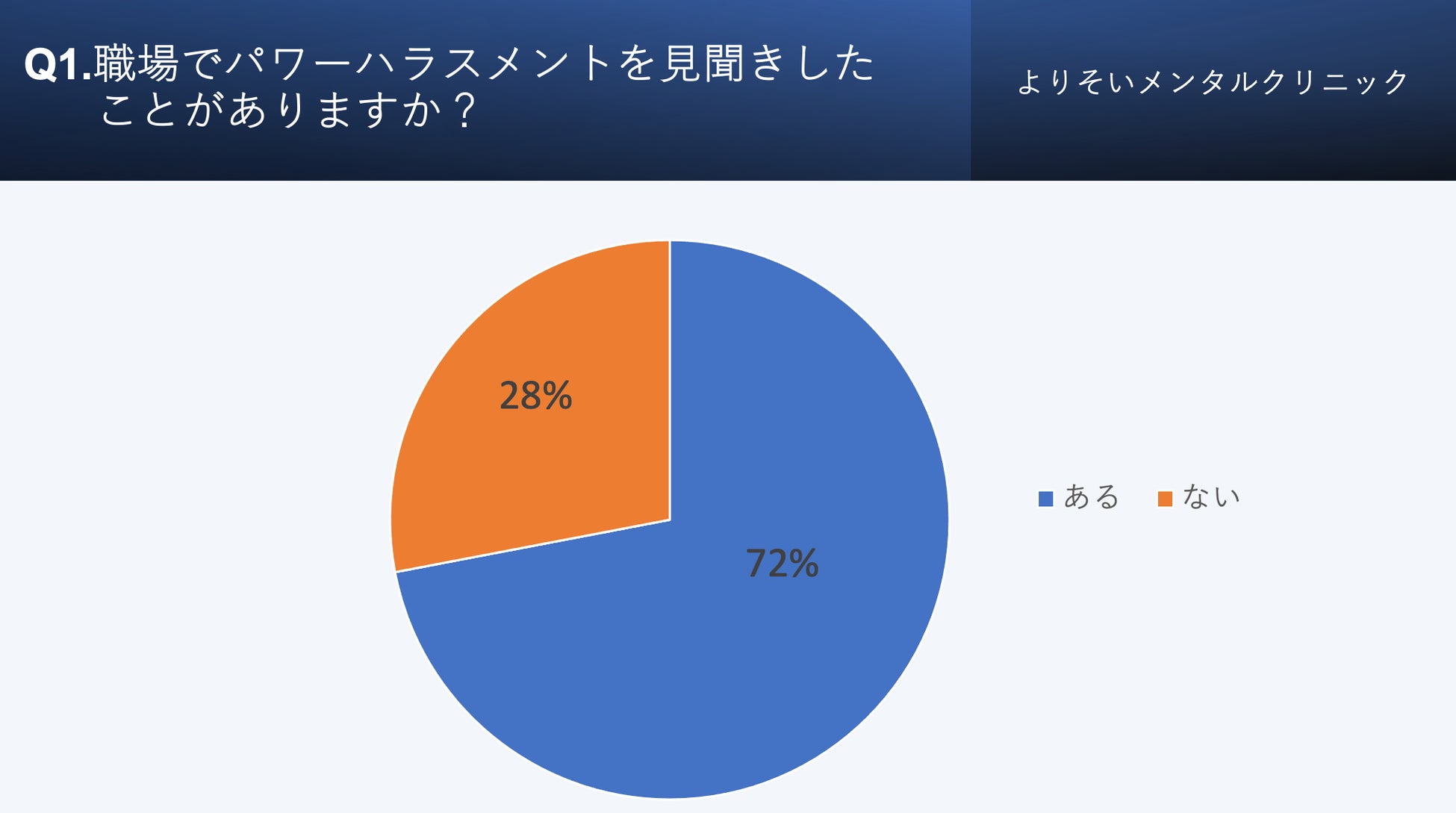 一般社団法人徳志会(所在地:東京都品川区、代表理事:河口雅弘)は、心療内科・精神科クリニックである新宿よりそいメタルクリニック(新宿駅東口徒歩3分)と横浜よりそいメタルクリニック(横浜駅西口徒歩2分)を運営し皆様のメンタルヘルスをサポートしております。今回は職場におけるパワーハラスメントに関する調査を実施したので、その結果を紹介します。
