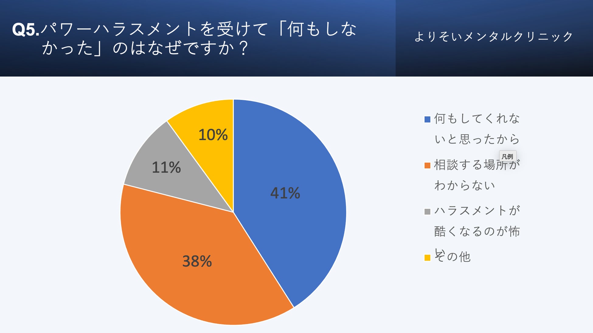 しかしながら、パワーハラスメントを経験しても「何もしなかった」「会社は何もしてくれないと思った」「相談する場所がわからない」などパワーハラスメントに対して対応はせずに我慢している現状にあることがわかりました。
