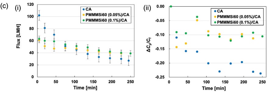 未加工の酢酸セルロース(CA)膜(青色プロット):開始直後は最も高い流束を示しますが、時間の経過とともに「大幅な低下」が見られます 。これは、膜の表面や細孔にタンパク質が急速にこびりつき、目詰まり(ファウリング)が進行していることを意味します。