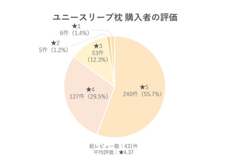 ユニースリープ枕は、楽天市場の赤ちゃん枕部門で1位を獲得している人気商品です。楽天市場の商品販売ページでは、販売開始から約9ヶ月の間に431件、5点満点中4.37点の購入者評価を獲得しています(いずれも2025年3月13日時点)。