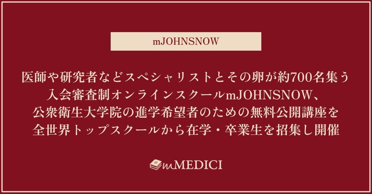 研究者・医療職のスペシャリストによって設立され、一流の知のプラットフォームを提供しているmMEDICI株式会社(代表取締役:廣瀬 直紀、以下「当社」)は、医師や医学研究者などのスペシャリストとその卵が約700名集う日本最大規模のパブリックヘルスオンラインスクールmJOHNSNOWにて、2024年12月20日(金)に、無料公開講座、「n=1で叫ぶ、MPHへの愛と本音~独断と偏見で語るMPH講義~」を開催いたします。