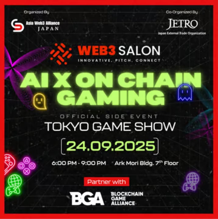 株式会社AI on Web3(本社:東京都渋谷区、代表取締役:Allen Chow)は、Blockchain Game Alliance、日本貿易振興機構(JETRO)と共同で、東京ゲームショウ(TGS)開催期間中にサイドイベント「Web3 Salon – TGS Side Event」を開催いたします。