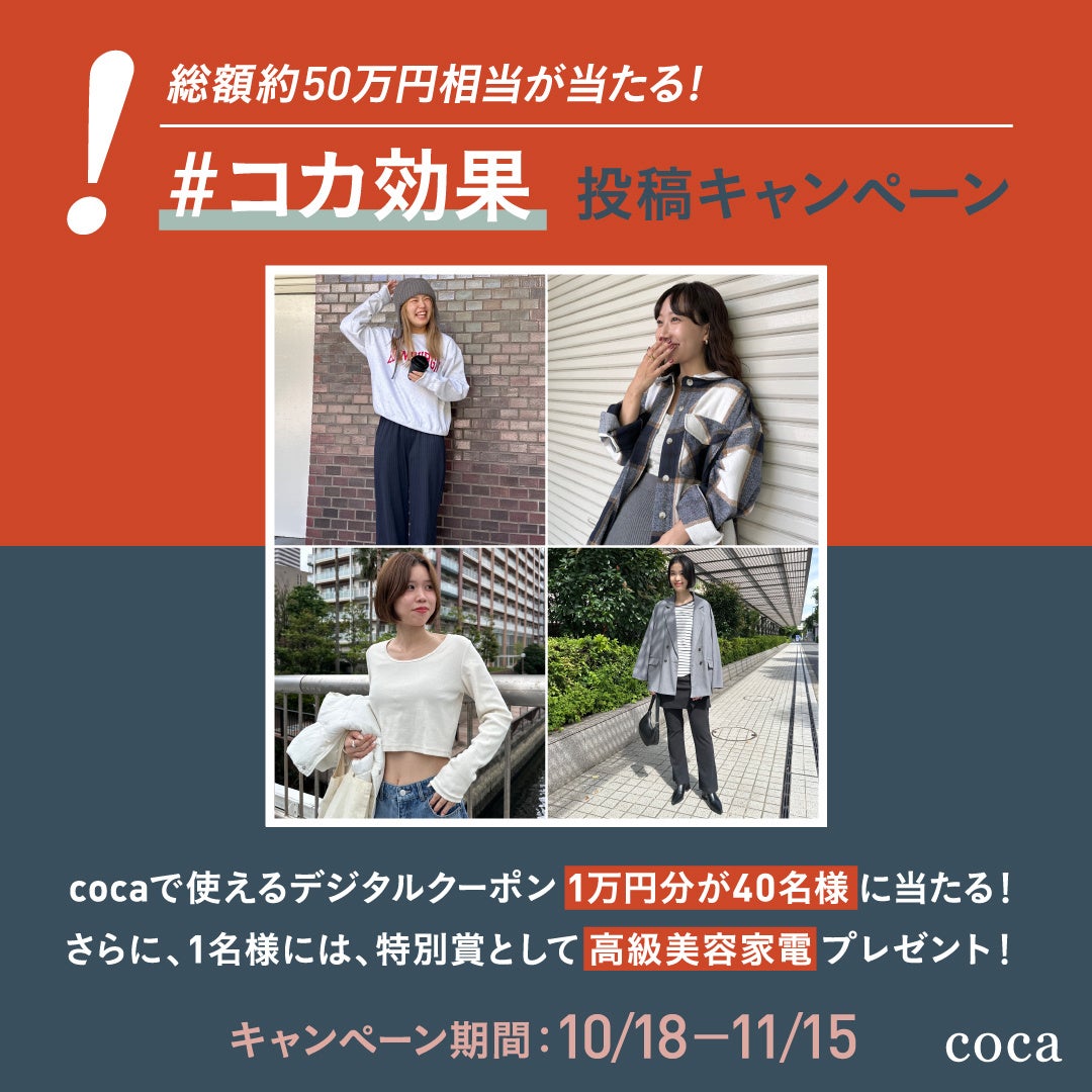 2024 年10 月18 日(金)~11 月15 日(金)の期間中、coca 公式Instagram では「#コカ効果キャンペーン」を開催中。ご自身が考える“自分なりのコカ効果”を投稿していただいた方の中から、高級美容家電やcocaで使えるデジタルクーポン総額40 万円分を抽選でプレゼント!皆さまのご応募お待ちしております。
