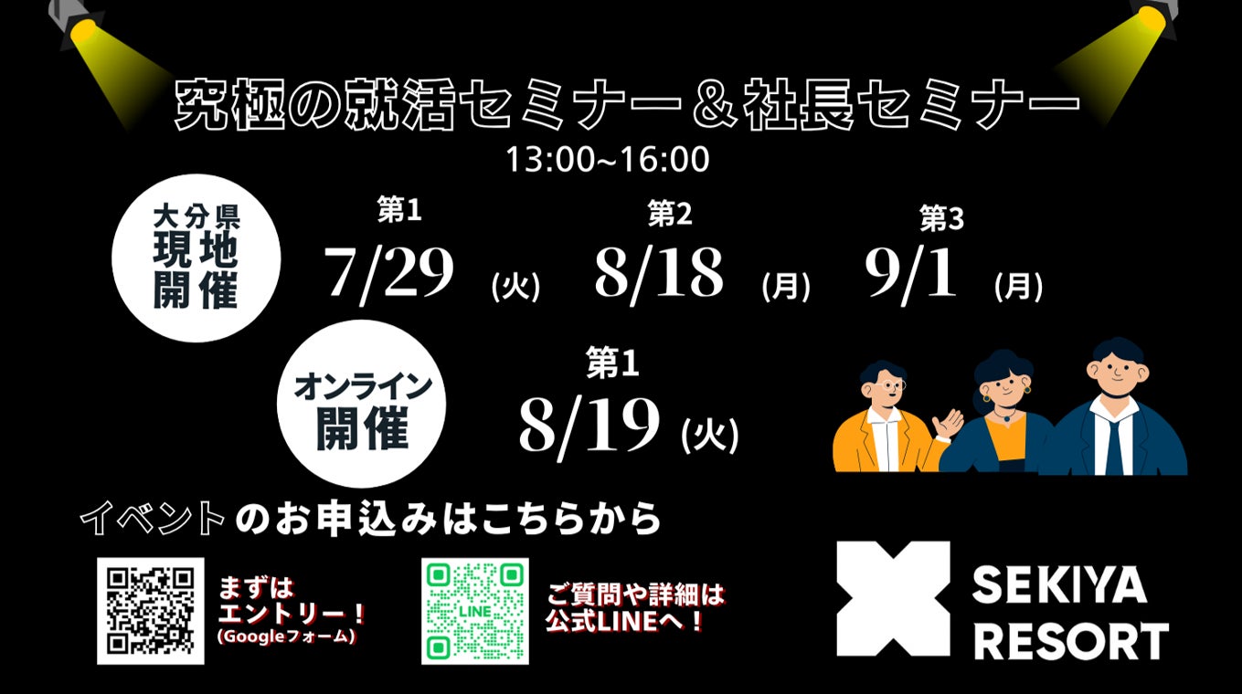 前半の「究極の就活セミナー」では、自分の“就活の軸”を明確化するための実践的フレームワークを伝授。これをマスターすれば、失敗しない企業選びがぐっと身近に。後半の「社長セミナー」では、SEKIYA RESORTの代表 林自らが登壇し、今後の宿泊・観光業界の展望と、これから求められる人材像について熱く語ります。自分らしいキャリアを描くなら、この一歩が必須です!