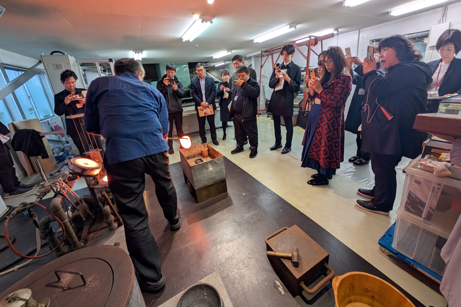 このツアーでは、金箔の溶解や圧延、箔打ちといった金箔の製造工程や、工芸品への箔貼りの様子を見学します。通常非公開のエリアに立ち入る為、職人の作業風景を間近に見ることができます。特に金の溶解の見学の機会は非常に貴重で、息を呑むような職人の作業の様子をご覧いただけます。この特別なツアーを通じて、まさに職人の世界に飛び込んだような臨場感を味わっていただけます。企業研修や視察などを含め、伝統工芸分野の産業に興味のある方、高付加価値を求める観光の方にお勧めのツアーです。