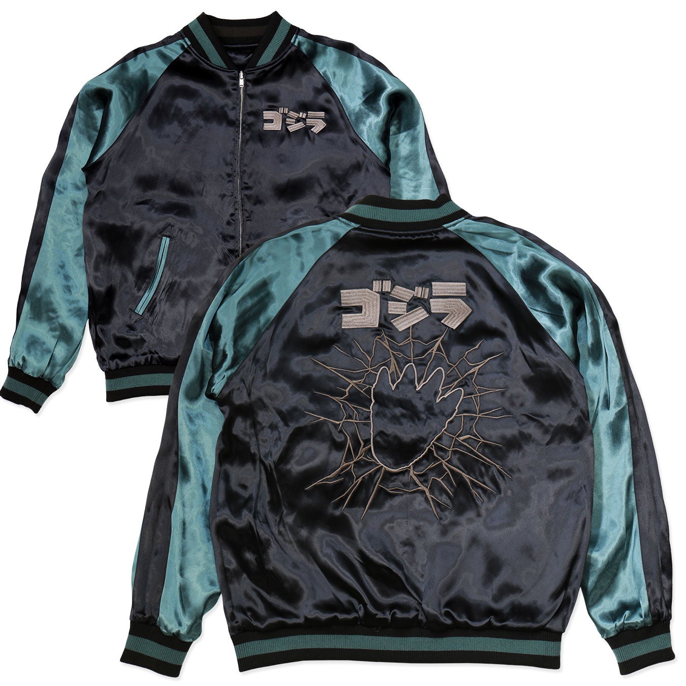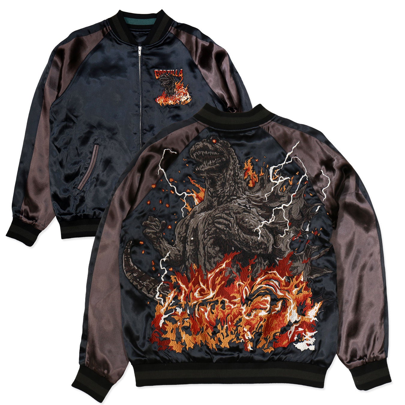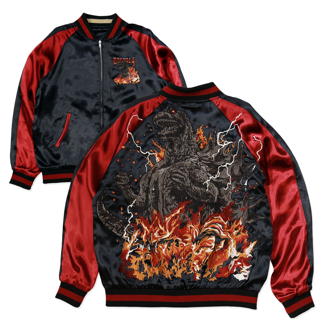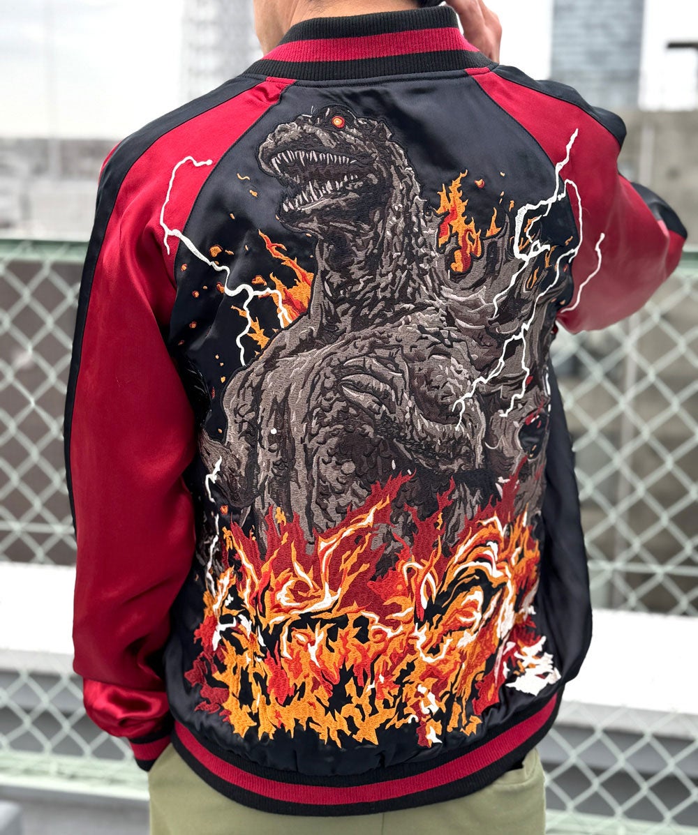 ●表面は『ゴジラ』(1984)のポスターを刺繍で表現した迫力のある大胆な構図のスカジャン。裏面はゴジラのロゴと足跡がインパクトがある。