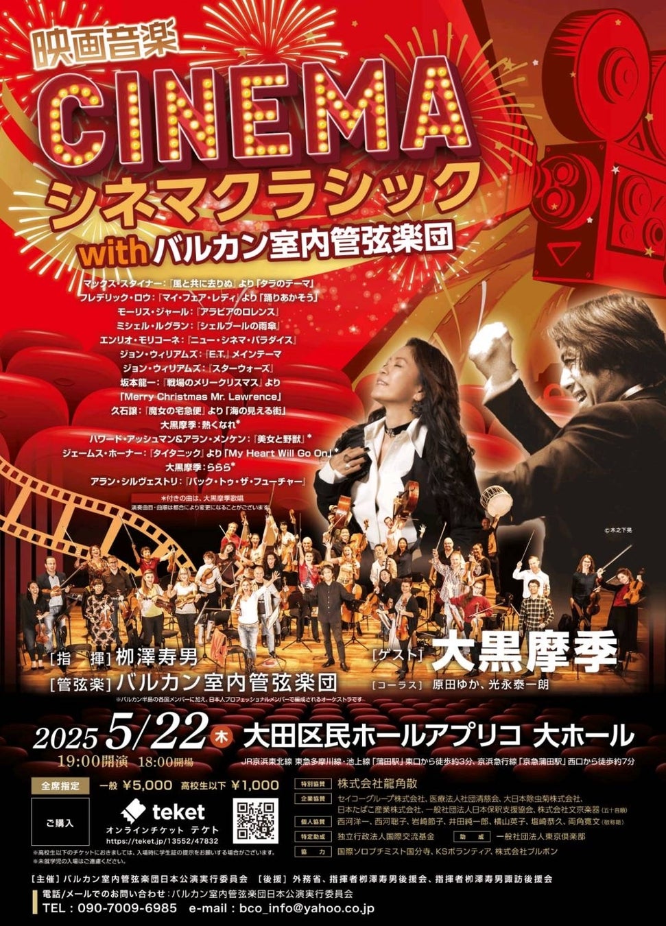 バルカン室内管弦楽団としては初の「映画音楽」コンサート。クラシックはちょっと敷居が高い・・・と感じている人にも、この「バルカン室内管弦楽団」の演奏を楽しんでいただきたい、という思いでこのような試みを企画しました。 映画も、言語や国境を越えて人々の心に届くエンターテイメントですから、このオーケストラとの共通点も感じます。そして、いくつかの楽曲では大黒摩季さんをゲストに迎えて演奏します。以前、映画音楽のオーケストラ共演でご一緒した際、会場中を沸かせた大黒さん。バルカン室内管弦楽団との初コラボというのも、見どころのひとつです。会場がひとつになる瞬間を楽しみにしています。