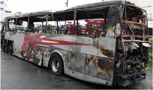 大型乗合バスが高速道路で分岐帯に衝突、横転・炎上し、続く後続車両も衝突。当該ドライバーと乗客1名が死亡し、乗客6名と後続車両のドライバーが重軽傷を負った。