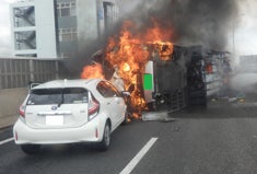 当該車両は衝突後すぐに車両前部から出火、後続の小型乗用車が避けきれず、炎上した当該車両の後部に衝突し、両車両とも全焼した。