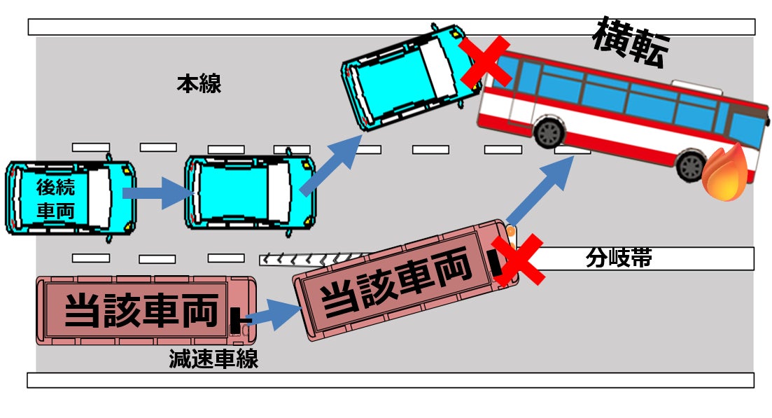 乗客7名を乗せた大型乗合バスが名古屋高速道路高速11号小牧線(下り)の豊山南料金所の減速車線を走行中、左方に斜走して分岐帯に衝突、本線内に進入し、横転・停止した。