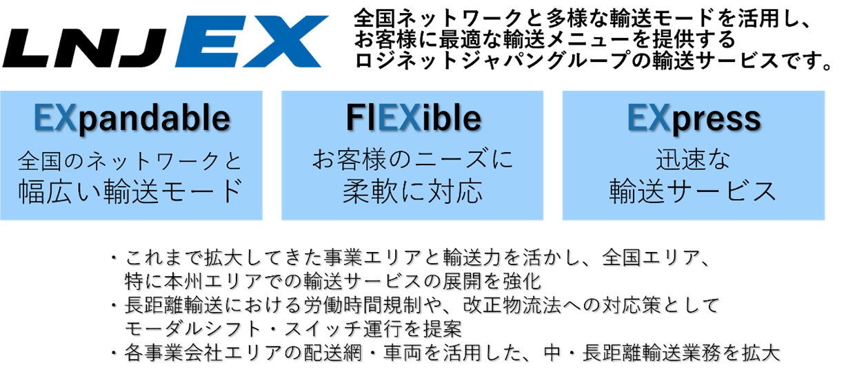 当社グループは、トラックや鉄道、航空機、船舶と様々な輸送モードを持ち、全国で事業を展開していますが、こうした総合力を「LNJEX」と名付け、お客様の物流課題を解決する輸送サービスとしてご提供しております。今回、九州エリアに積み替え・貨物集約・一時保管・流通加工を担う新拠点を置くことで、九州⇔関西⇔関東をつなぐ輸送サービスを強化し、「LNJEX」の更なる推進を図ります。