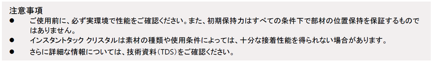 インスタントタック(Instant Tack)は、「Instant(=すぐに)」「Tack(=保持できる粘着性)」の名前の通り、初期保持力に優れた製品で、ヘンケル独自 Flextec Polymer技術※1 を採用しています。