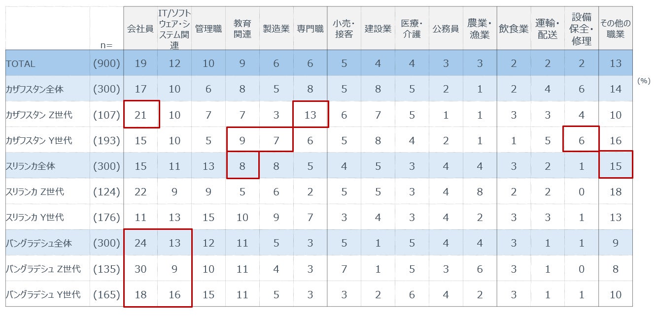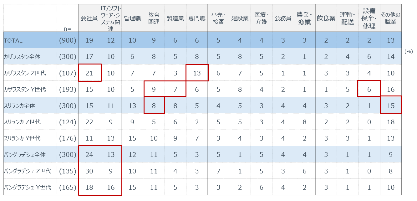 こうした生活基盤の違いは就業構造にも表れている。カザフスタンおよびバングラデシュでは会社員やIT関連職といった都市型就業の比率が高く、特にバングラデシュでは世代を問わず都市型労働が主流である。一方、スリランカでは教育など地域に根差した職業が多く、生活圏密着型の就業構造が特徴となる。カザフスタンにおいては、Z世代が都市型就業、Y世代が地域密着型就業といった世代差も確認された。