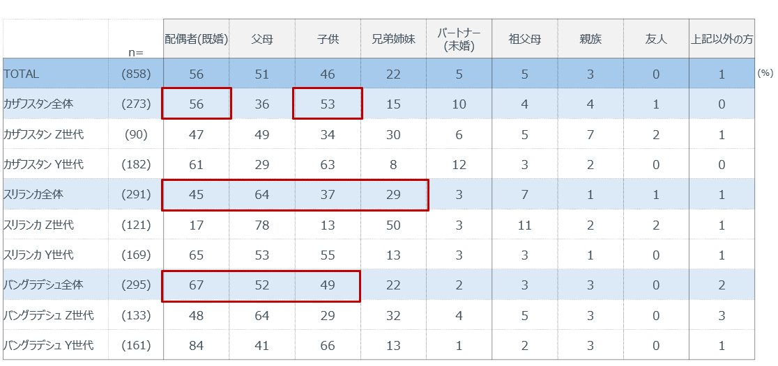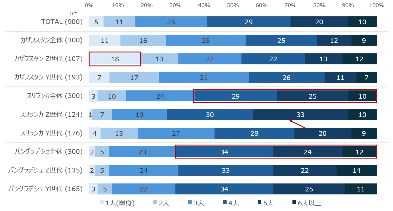 まず世帯構成においては、カザフスタンが核家族中心であるのに対し、スリランカおよびバングラデシュでは4人以上の世帯が過半を占め、親族と同居する複合家族が一般的である。特にカザフスタンではZ世代の単身世帯が18%と一定割合存在し、個人単位の生活スタイルが進展している一方、他2か国では家族単位での生活が前提となっている。
