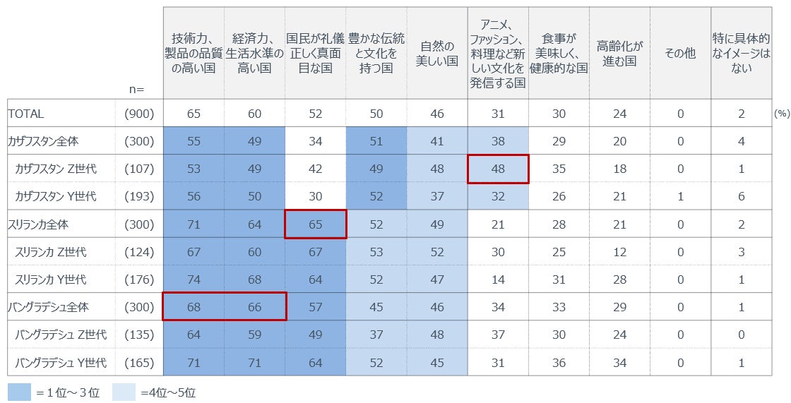 さらに、日本の国イメージとしては「技術力」「製品品質」「高い生活水準」が共通して挙げられ、スリランカでは「礼儀・規律」、バングラデシュでは「経済力」への評価が特徴的である。
