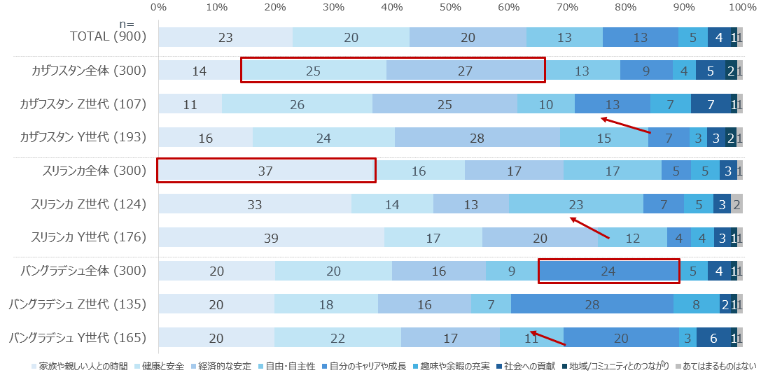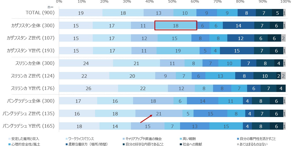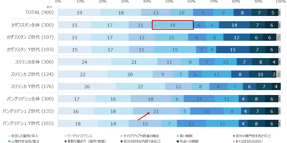 仕事においては、3か国共通で「ワークライフバランス」と「安定」が重視される一方、カザフスタンでは高報酬志向、バングラデシュのZ世代では昇進・キャリアアップ志向が強く表れている。