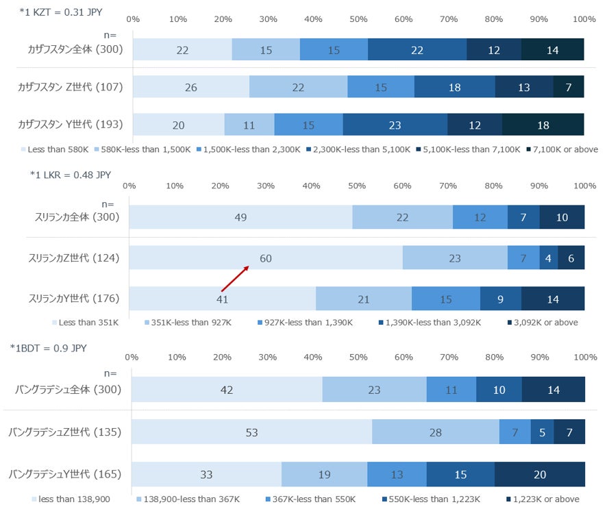 所得構造についても国ごとの差は顕著であり、カザフスタンでは中上位〜富裕層が中心となる一方、スリランカは低〜中所得層が主体の構造となっている。バングラデシュでは低所得層と高所得層が併存する二極化傾向が見られ、特にY世代に高所得層が集中している点が特徴的である。