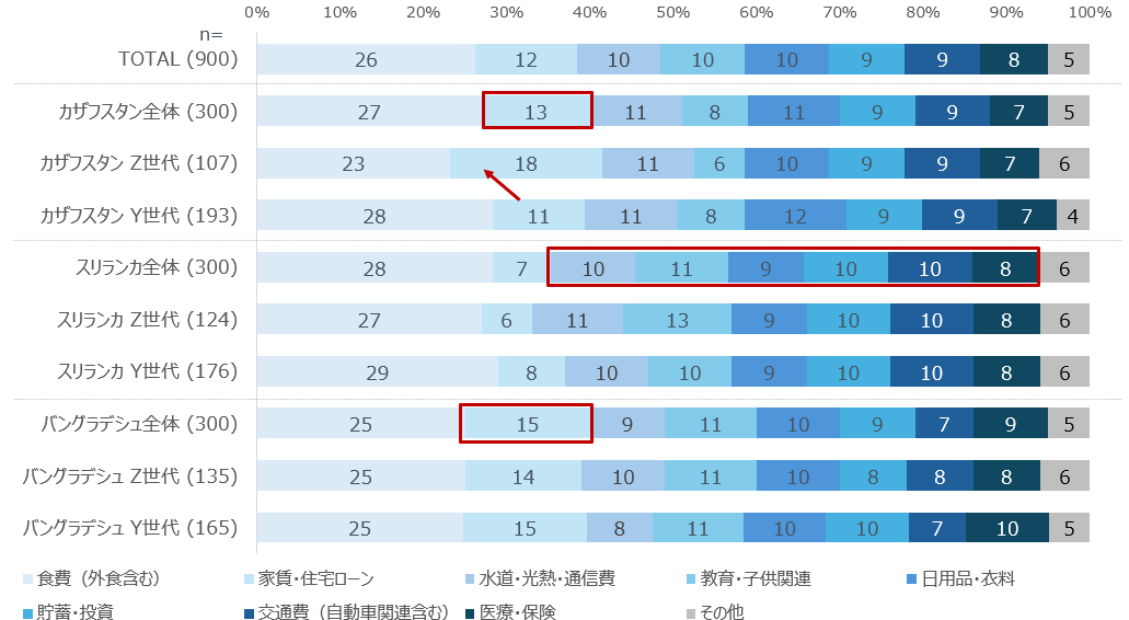 さらに家計支出の構成からも、各国の生活様式の違いが浮き彫りとなる。3か国共通で食費が最大項目となる一方、カザフスタンおよびバングラデシュでは住居費の比率が高く、都市生活に伴う固定費負担の大きさがうかがえる。特にカザフスタンのZ世代では住居費負担が顕著である。一方、スリランカでは教育費や日用品、光熱費の比重が高く、家族単位での生活維持を重視する構造が反映されている。