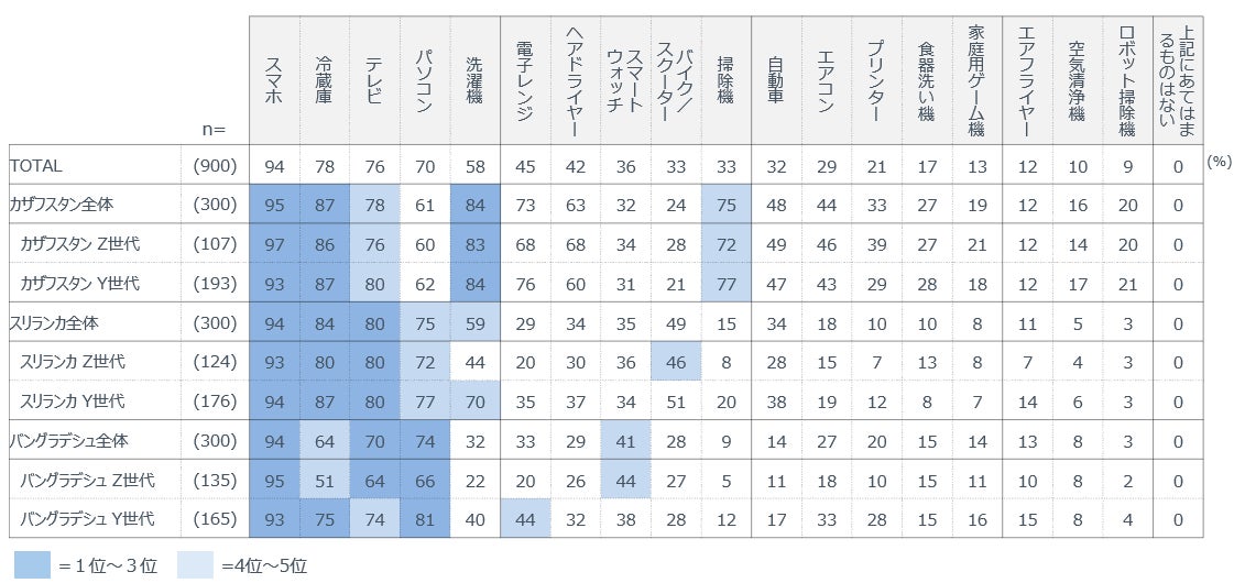 これらの違いは住環境にも反映されている。スマートフォンや冷蔵庫、テレビといった基礎家電は3か国で共通して普及しているが、カザフスタンでは電子レンジや掃除機などの保有率が高く、家事の機械化が進展している。一方、スリランカおよびバングラデシュでは基礎家電中心にとどまり、家族単位での生活を前提とした住環境が維持されている。