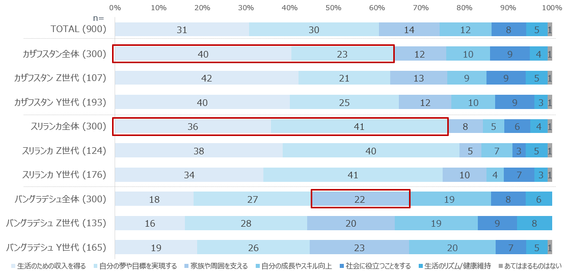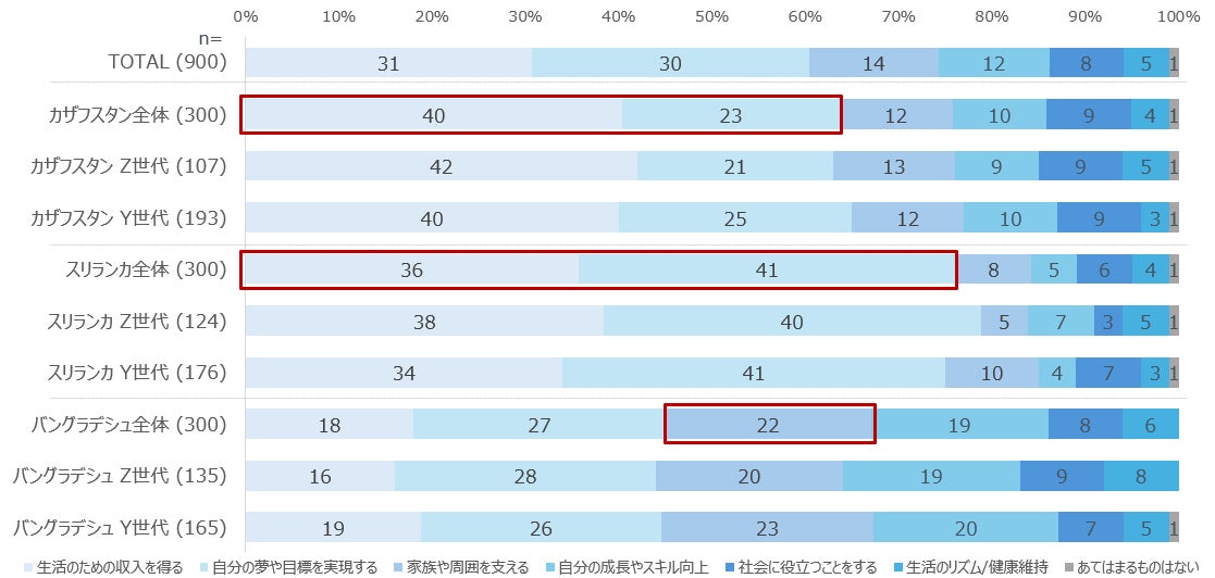 また、働く目的はカザフスタンおよびスリランカでは「生活のため」と「自己実現」の二軸であるのに対し、バングラデシュでは「家族や周囲を支える」という意識が相対的に強い。