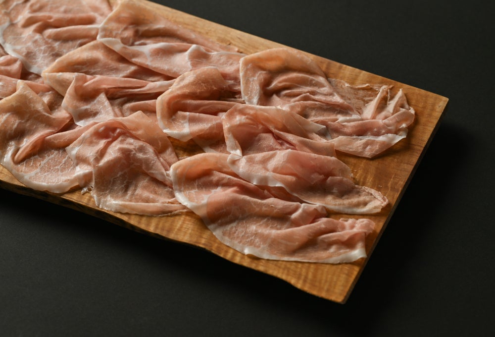 八ヶ岳の冷涼な風を活かした自然乾燥熟成にこだわり、最低12ヶ月、長いものでは36ヶ月の熟成を経て、チーズのような深いコクを生み出します。発酵食品として乳酸菌の働きにより旨味が増し、オレイン酸を多く含むため健康面でも注目されています。「脚のついたオリーブオイル」とも呼ばれ、悪玉コレステロールを抑える効果も期待される生ハムです。素材の力を最大限に活かし、日本人の嗜好にも合う繊細な味わいを提供しています。