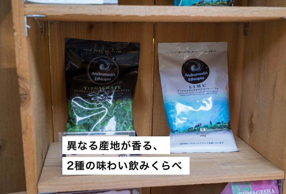 アンドロメダエチオピアコーヒーは、リムとヤルガッチャフェの2種類があります。リムはエチオピアのカファ地方・リム丘陵で育てられており、アラビカ種のコーヒー発祥の地でもあります。ヤルガッチャフェは、エチオピア南部のシダモ地方・ヤルガッチャフェで育てられ、リムに隣接する森です。