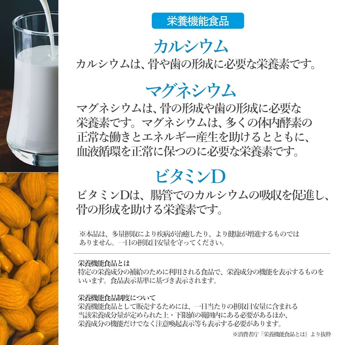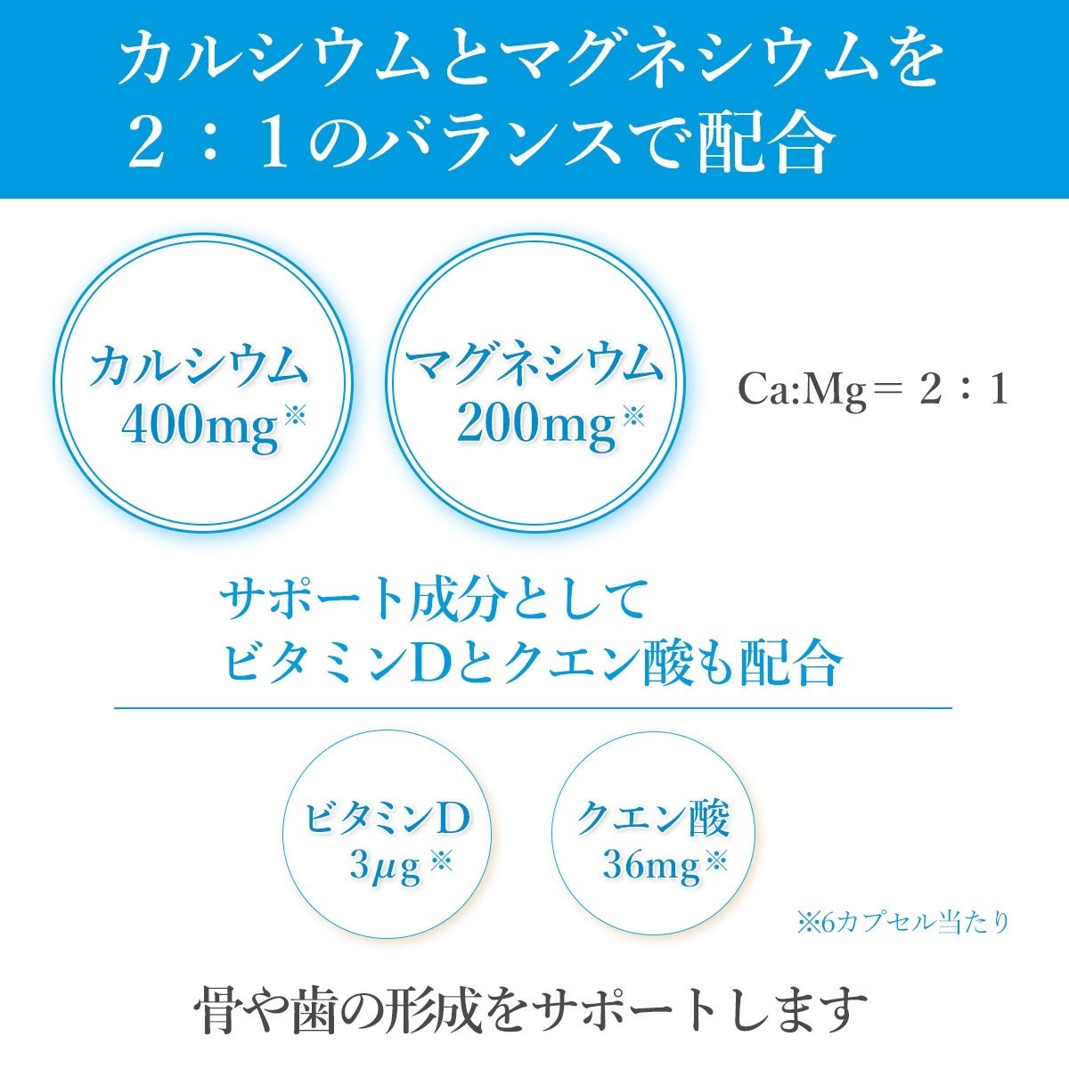 ・配合成分:カルシウム400mg、マグネシウム200mg、ビタミンD3.0µg、クエン酸36mg