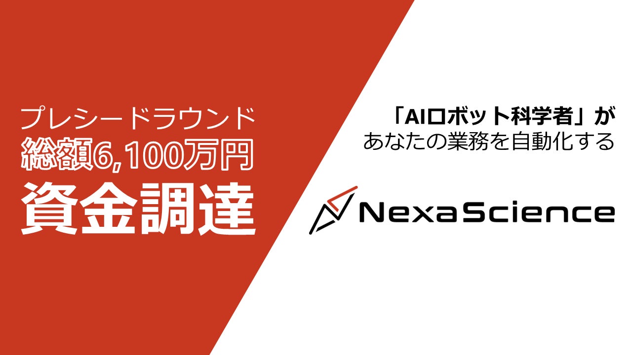 株式会社NexaScience(以下、NexaScience)は、業務自動化AIの基盤技術を確立し、研究開発〜知財〜事業化を一気通貫で自律化する「自律駆動科学」プラットフォームの実装に向け、総額6,100万円の資金調達を完了したことをお知らせいたします。今回のプレシードラウンドでは、東証プライム上場企業である長瀬産業株式会社のグループ会社が運営するコーポレートベンチャーキャピタル(CVC)ファンド、第二電電(現:KDDI)創業者の千本倖生氏や、自然言語処理AI企業の草分けである株式会社FRONTEOの元CTO・武田秀樹氏(現:株式会社Footlight)などの個人投資家等を引受先とした、J-KISS型新株予約権により調達を実施しました。