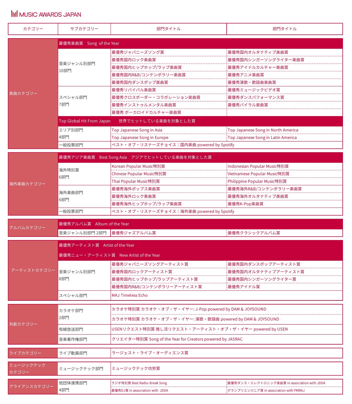 本アワードでは最優秀楽曲賞、最優秀アーティスト賞など主要6部門をはじめ、全62部門を創設いたしました。全62部門は、24部門の楽曲カテゴリー、14部門の海外楽曲カテゴリー、3部門のアルバムカテゴリー、11部門のアーティストカテゴリー、4部門の共創カテゴリー、ライブカテゴリー1部門、ミュージックテックカテゴリー1部門、そして4部門のアライアンスカテゴリーと、バラエティーに富んだラインアップとなりました。