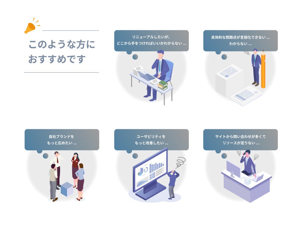 人間工学・心理学に基づき、ユーザビリティやインタラクティブなど、8つの観点からプロデザイナーがあなたの気づいていないWebサイトの課題点を見つけ出し、企業の成長をサポートします。