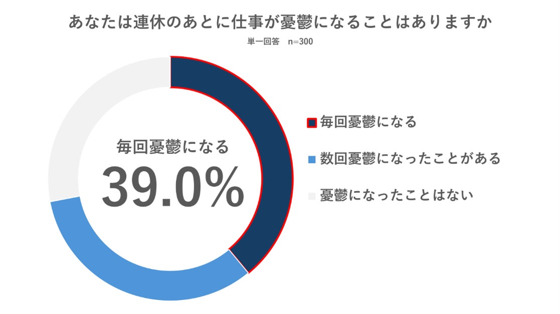 調査結果によると、社会人1~3年目の社員の72.0%が「連休明けに仕事が憂鬱になることがある」と回答。さらにそのうち、3人に1人以上(39.0%)は“毎回憂鬱になる”と答えており、「あ、また来たな」と感じる人も多いようです。