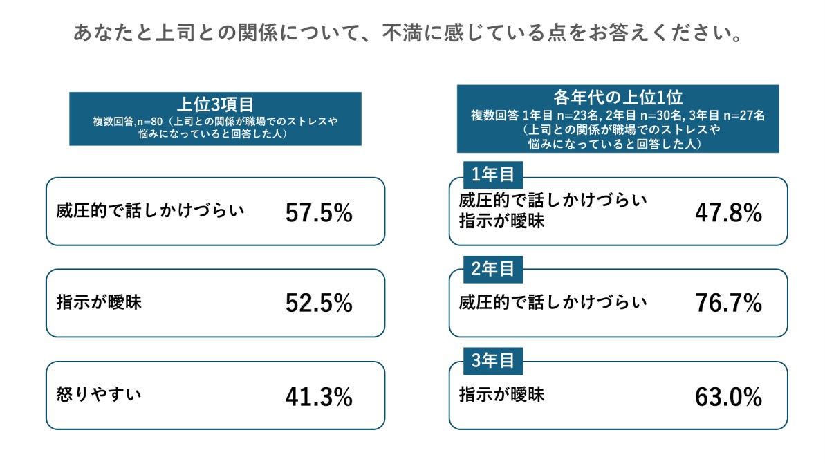 上司との関係における不満の1位は、「威圧的で話しかけづらい」(57.5%)。次いで「指示が曖昧」(52.5%)、「怒りやすい」(41.3%)が挙がりました。