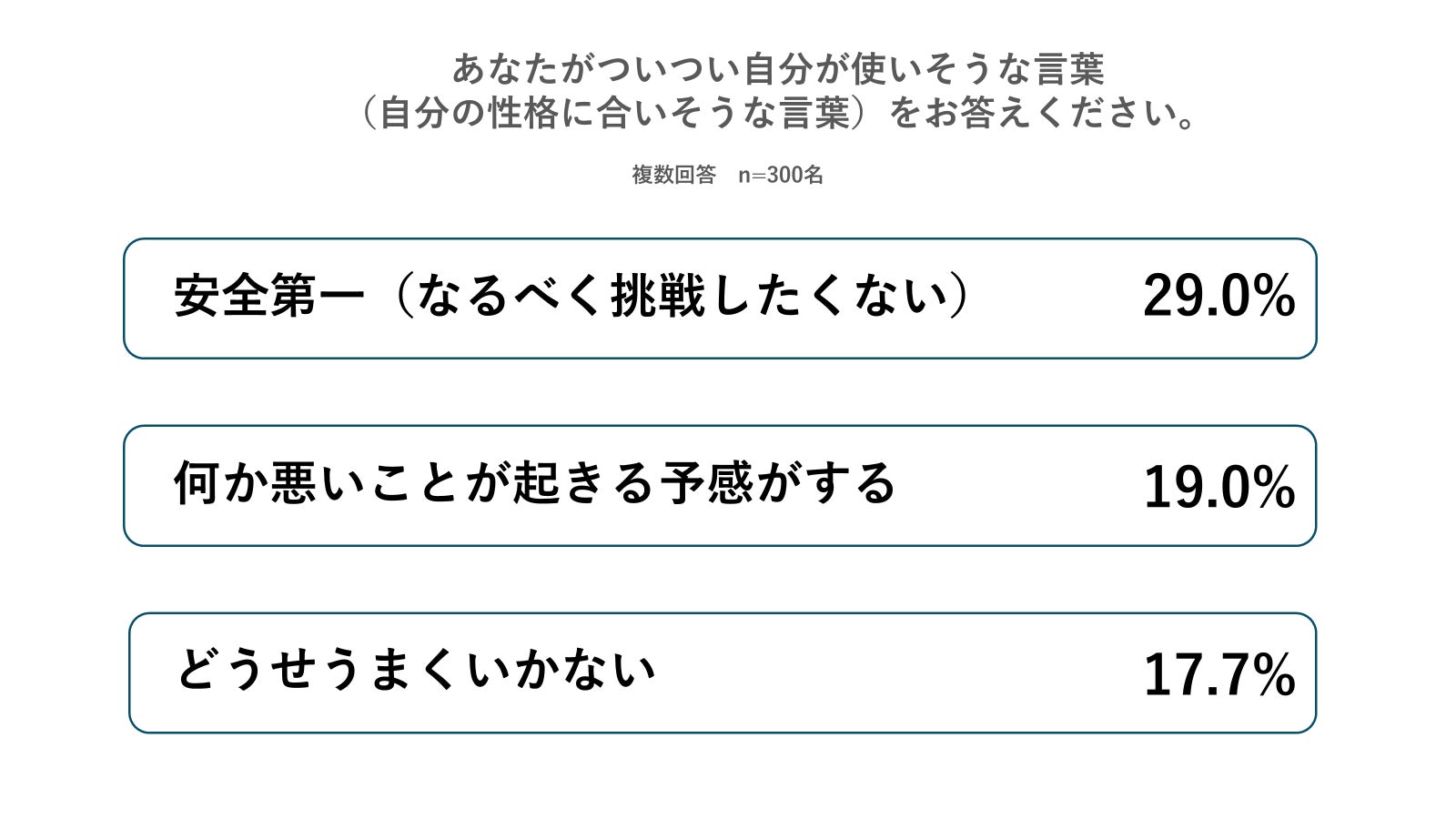 また、日常に潜むあるあるな負の感情に着目する「アンチ図鑑」として、「自分の性格に合いそうな言葉」を答えてもらいました。最も多かった回答は、「安全第一(なるべく挑戦したくない)」(29.0%)。続くのは「何か悪いことが起きる予感がする」(19.0%)、「どうせうまくいかない」(17.7%)と、前向きよりも“用心”や“不安”が先行している人が多いことがうかがえます。