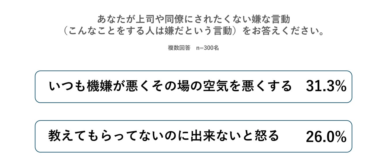 上司や同僚にされたくない言動を聞いたところ、「いつも機嫌が悪くその場の空気を悪くする」が最も多く31.3%、次いで「教えてもらっていないのに出来ないと怒る」(26.0%)が挙がりました。理不尽な怒りでこちらの心を乱すような言動に傷つく若手社員が多い結果になりました。