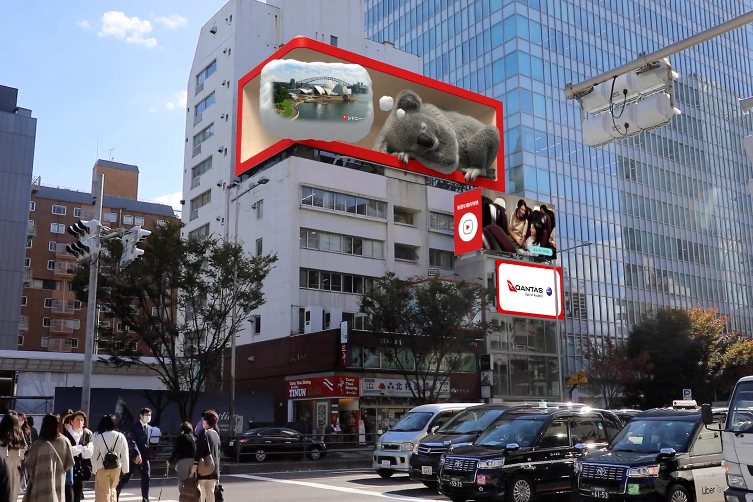 東京で最も賑わうエリアのひとつである渋谷と表参道に、6月23日から1週間限定で掲出されるこの3D屋外広告では、夢見るコアラが登場。オーストラリアの象徴的な風景や、カンタス航空ならではの快適な空の旅を夢見る様子が描かれており、日本の旅行者に向けて、「オーストラリアの夢の続き」をカンタス航空で体験してほしいという想いが込められています。
