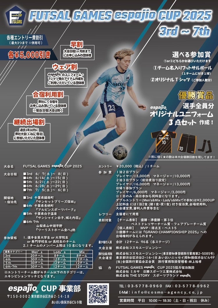 株式会社コスモエージェンシー(所在地:東京都渋谷区)が運営する、アパレルブランドespajio(https://espajio.jp/)は、6月より大学生向けの宿泊大会「FUTSAL GAMES ESPAJIO CUP」を開催し、参加団体やスポンサーを募集します。