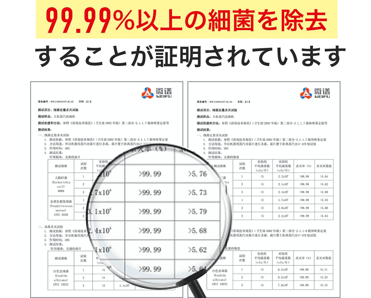 『特許開発の105度高圧スチームテクノロジーが実現する、驚異の99.9%除菌力。』