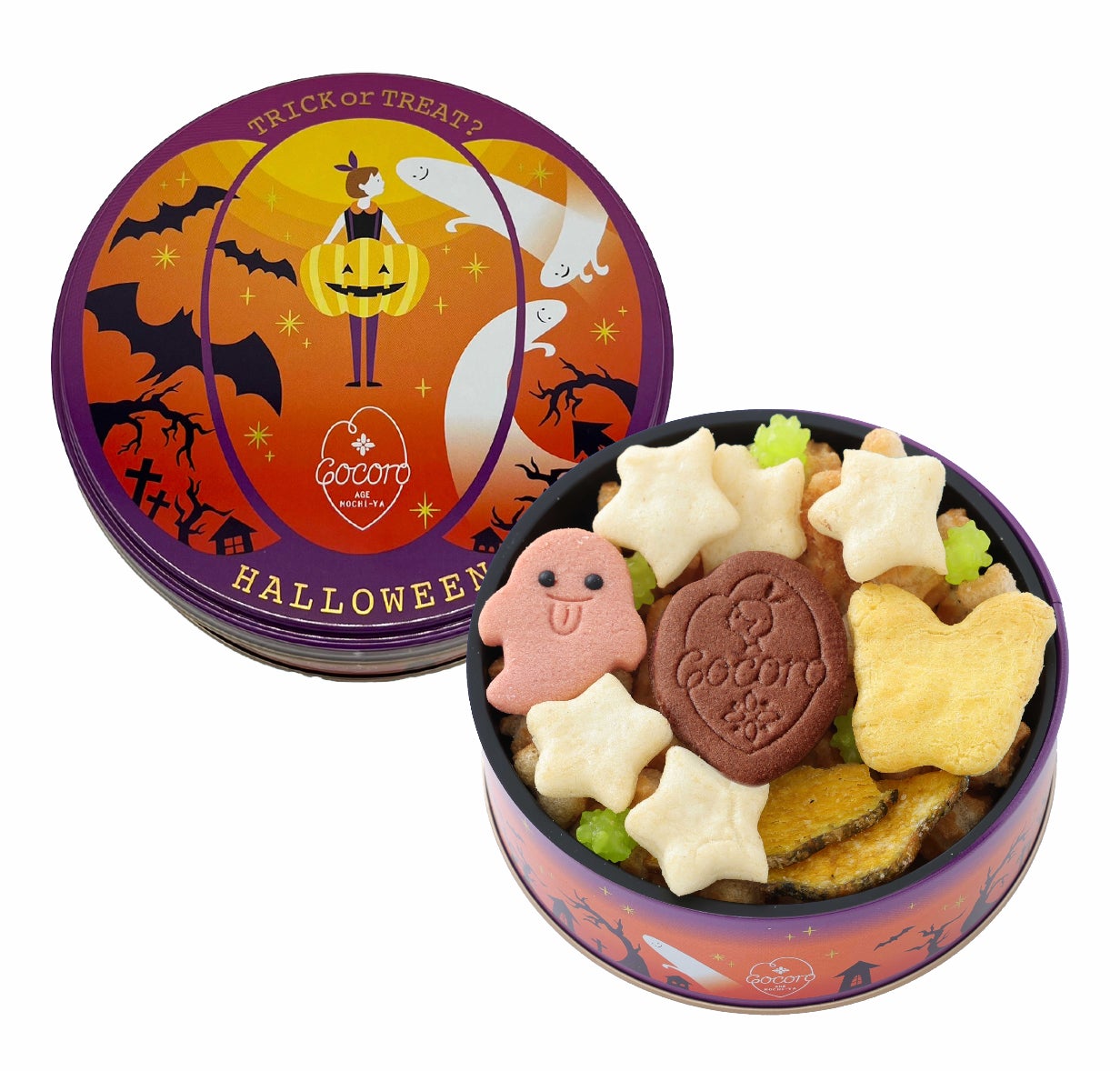 イチゴ味のおばけクッキー、しお味の星型おかき、かぼちゃチップなどハロウィンを詰め込んだ、この時期だけの限定缶です。