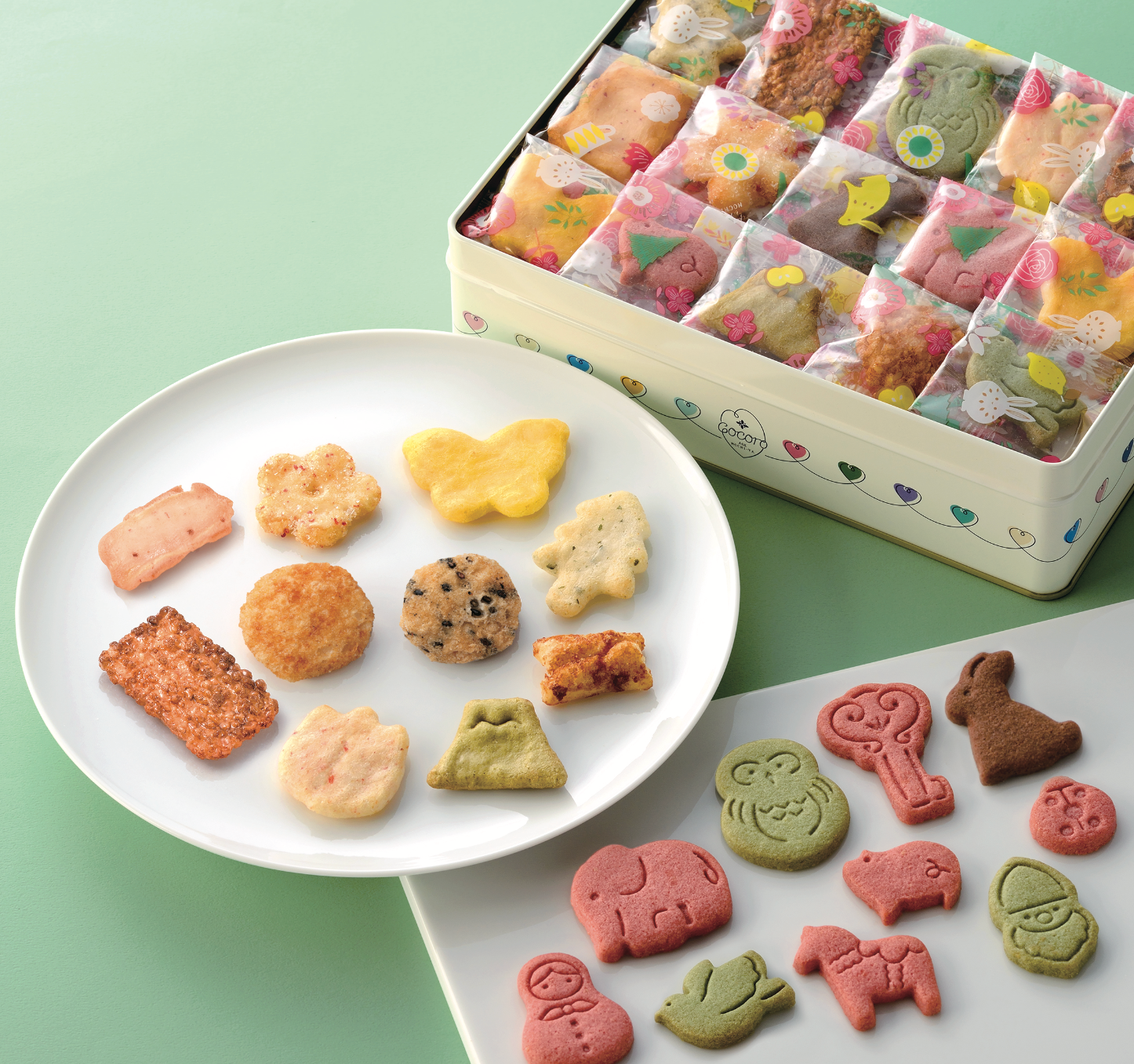 色々な味と形のおかきと米粉入りクッキーのミニ缶です。