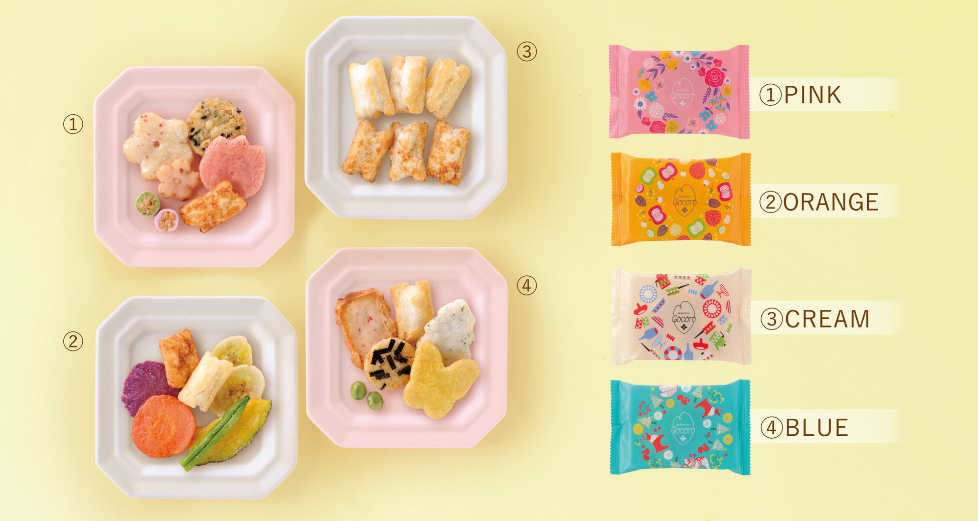 [おかき]や[あられ]が食べきりサイズの可愛いらしい個包装に入っています。