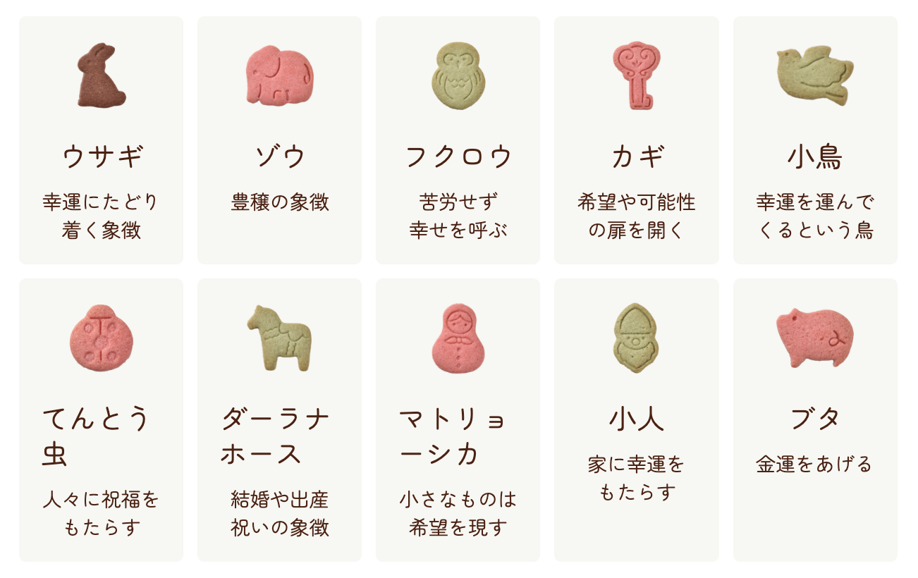10種類のラッキーチャームをかたどった米粉入りクッキーの