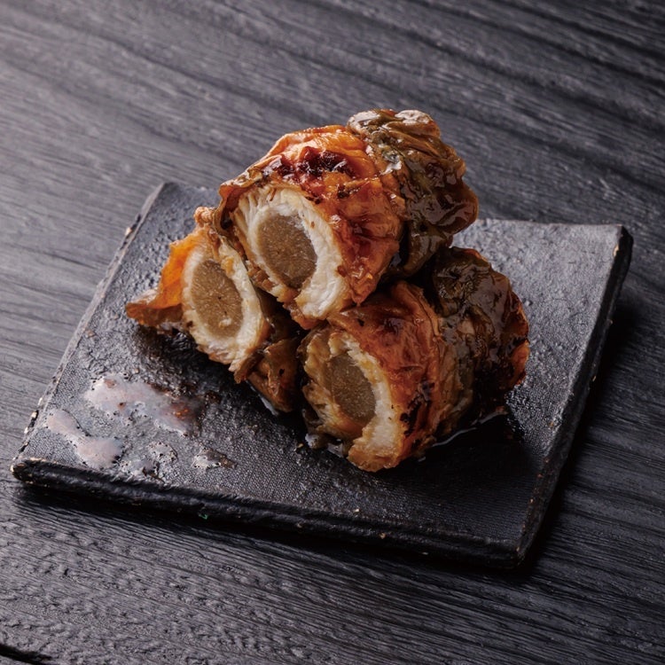 牛蒡に鰻を巻き炭火で焼き上げ、じっくり炊いた逸品。「細く長く続く幸せ」との願いを込めて。