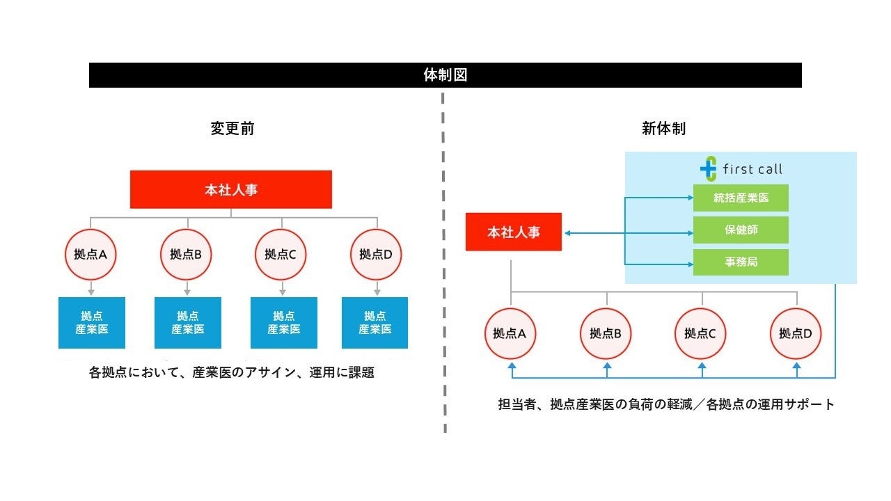 そこで、「first call」により提供される「統括産業医」が、全社統一の基準を策定する体制に変更しました。この体制では、全国に点在する一定の条件を満たす事業場にて選任された「産業医」が、統一された基準に則り業務遂行を実施します。加えて、産業医はもちろん人事・労務担当者の業務効率化のため、既存の健康管理システムに関するオペレーションの見直しを行いました。