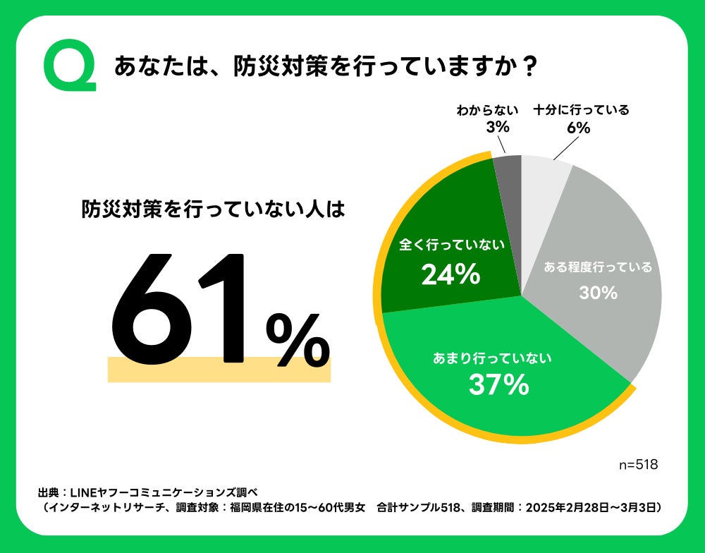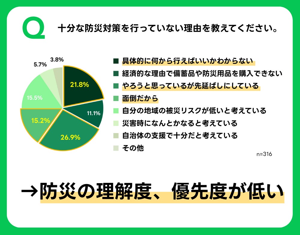 当社が実施した福岡県民518名が対象のインターネット調査によると、防災対策ができていないと感じる人は61%にのぼり、「やろうと思っているが先延ばしにしている」「具体的に何から行えばいいかわからない」「面倒」など、十分に防災に取り組めていない、防災の優先度が低い人が半数を超えるという結果が見られました。