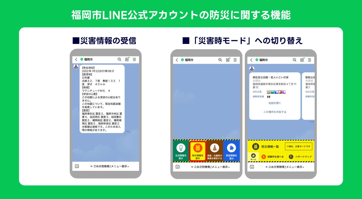 本訓練を実施する福岡市LINE公式アカウントでは、普段の生活に便利な機能が備わる中、福岡市が発表する災害情報を受け取れる機能や、災害時の避難行動をサポートする「災害時モード」に切り替わる機能など、災害に対応した機能も実装されています。