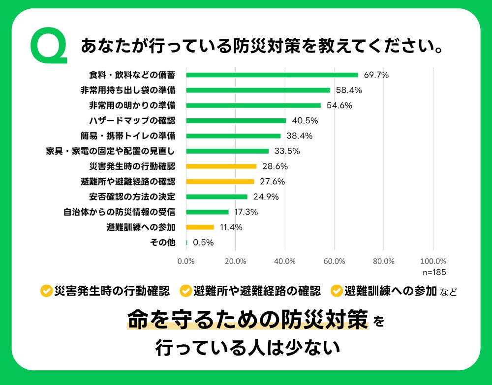 さらに、同調査にて、実施している防災対策を質問したところ、「食料・飲料などの備蓄」「非常用持ち出し袋の準備」など被災後の生活に対する備えは比較的行われている一方、「災害発生時の行動確認」「避難所や避難経路の確認」など、発災時に最優先に取り組むべき、命を守るための防災対策に取り組んでいる人は少ないという結果が見られました。