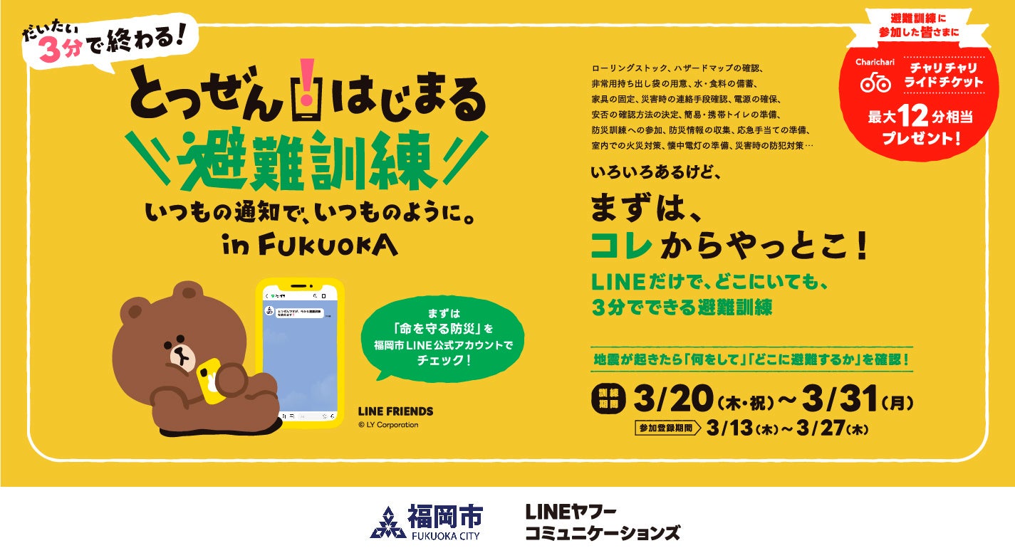 LINEヤフーコミュニケーションズ株式会社(本社:福岡市博多区、以下当社)は、福岡市と共働し、コミュニケーションアプリ「LINE」(以下、「LINE」)の機能を活用したオンライン避難訓練「とつぜんはじまる避難訓練」を実施します。