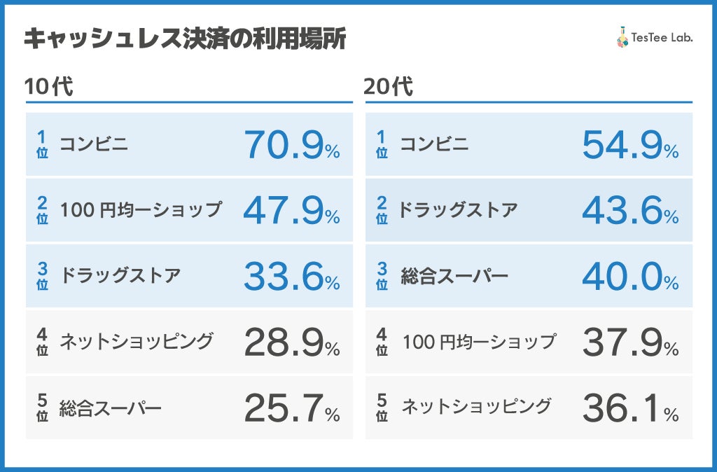 キャッシュレス決済を利用している人を対象に、利用する場所について尋ねたところ、10代・20代ともに最も多かったのは「コンビニ」でした。次いで、10代では「100円均一ショップ」が2位となり、20代では「ドラッグストア」が2位にランクインしました。